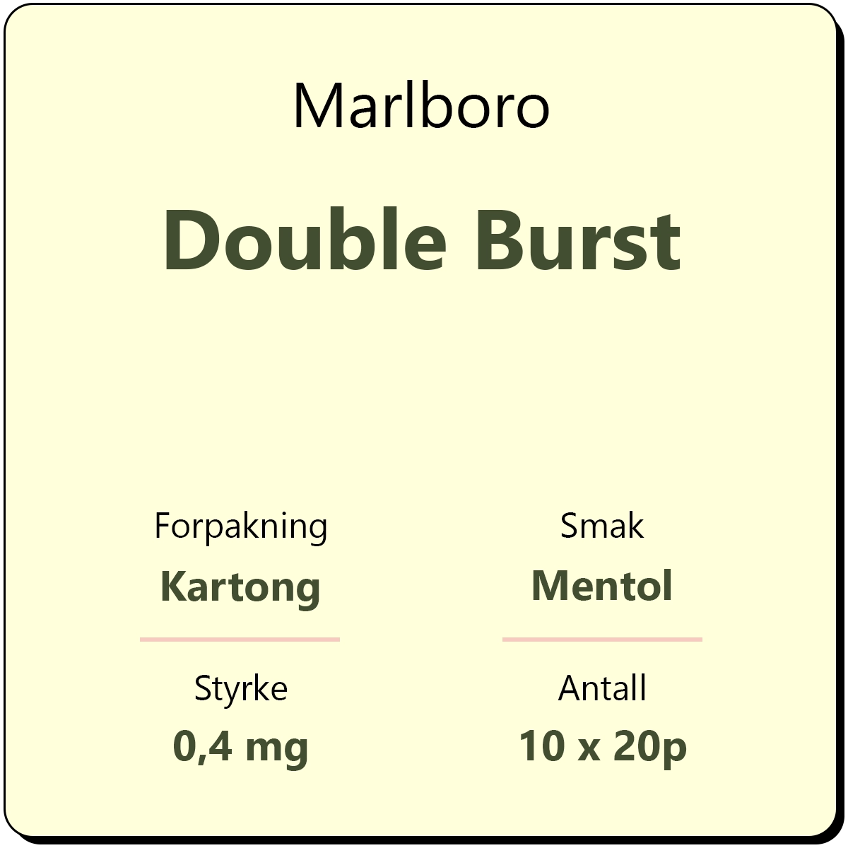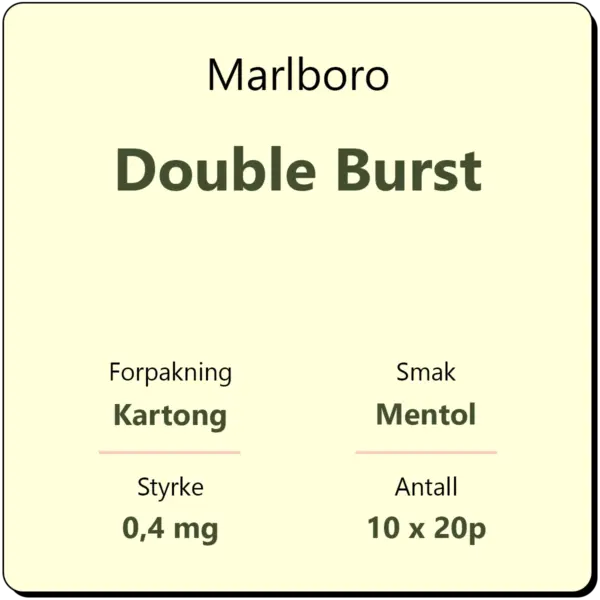 Marlboro Double Burst består av 10 sigarettpakker med 20 sigaretter i hver pakke. Dette er en klassisk sigarett med filter fra produsent Philip Morris International. Ved å trykke på filteret blir en kapsel med smak av mentol utløst og gir en frisk røyksmak.