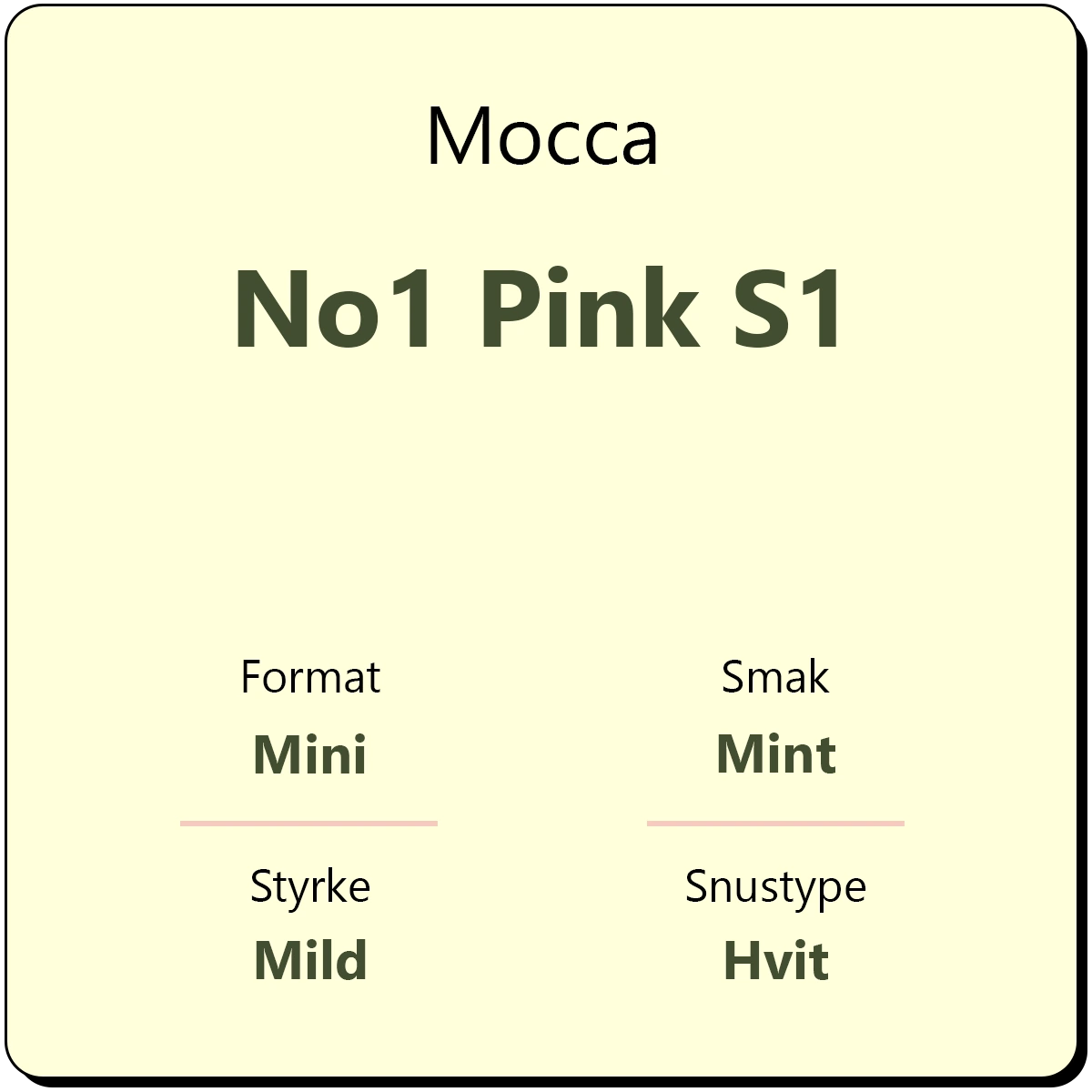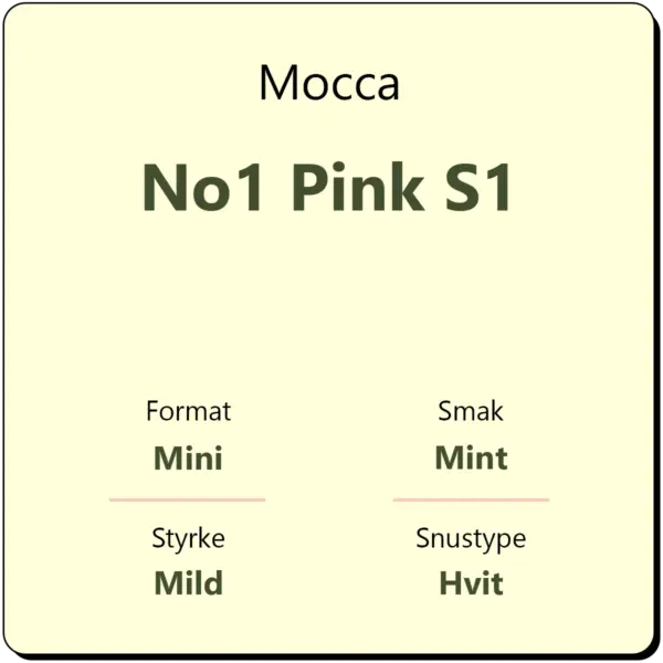 Mocca No1 Pink S1 er en tørr hvit snus i mini porsjon. Mocca Pink byr på en smak av søt mint og et hint av vanilje, samt en mild smak av tobakk.