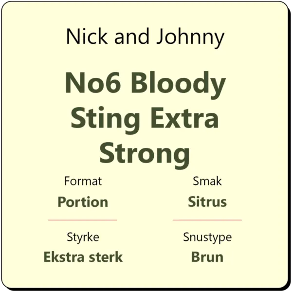 Nick & Johnny No6 Bloody Sting Ex Strong er en original brun porsjonssnus med smak av både sitrus og ingefær. Snusen byr på et nikotininnhold på 14 mg/g, tilsvarende en ekstra sterk snus. Hver boks med No6 Bloody Sting inneholder ca. 20 porsjonsposer. Varemerket Nick and Johnny oppstod originalt kun for salg i Norge, men ble etter hvert tilgjengelig også i Sverige.