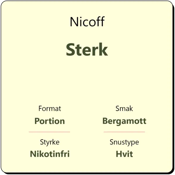 Nicoff Sterk er en tobakks- og nikotinfri snus med smak av bergamott og pepper. Snusen helt fri for både tobakk og nikotin. Snus fra Nicoff inneholder vitaminer, mineraler og koffein, men den inneholder ikke ginseng. Snusen kommer i klassisk hvite porsjonsposer med et originalt porsjonsformat. Nikotinfri snus er ikke avhengighetsskapende.