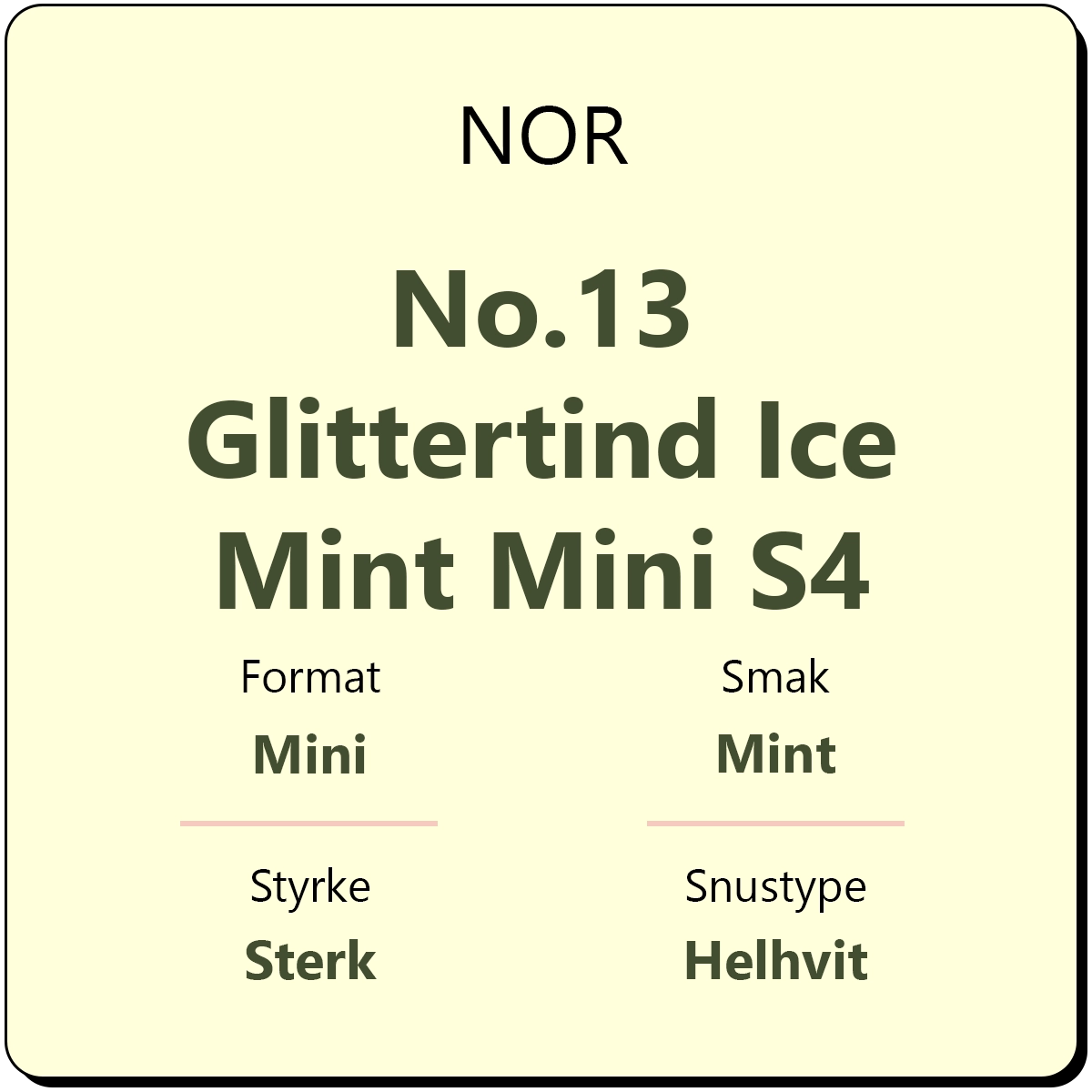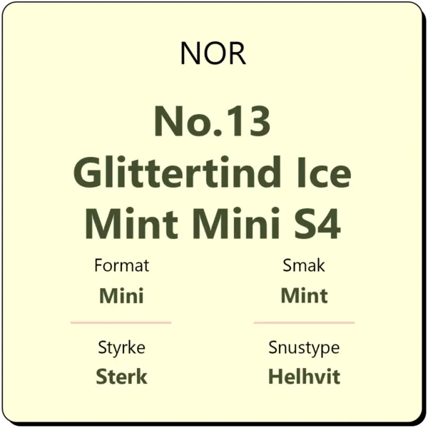 NOR No.13 Glittertind Ice Mint Mini S4 er en snus med smak av mint. NOR No.13 kommer i delikate helhvite porsjonsposer i et mini porsjonsformat. Hver boks inneholder ca. 32 porsjonsposer. NOR snus er produsert av Den Norske Snusfabrikken.