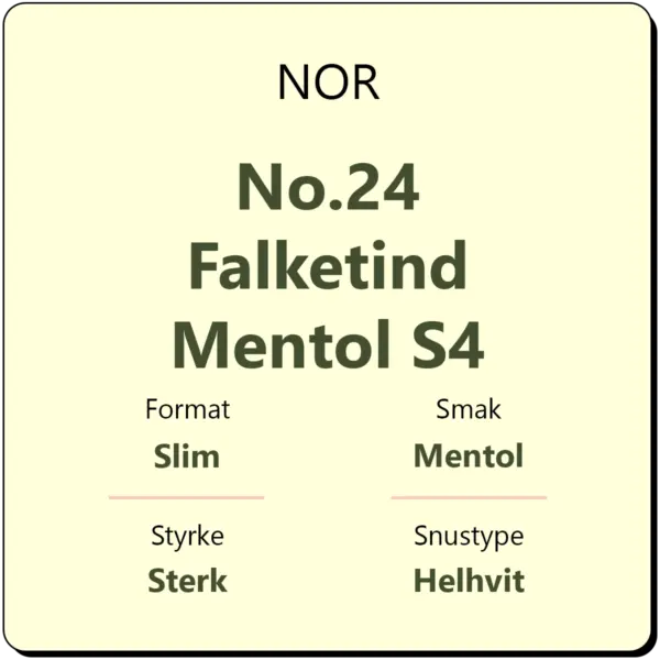 NOR No.24 Falketind Mentol S4 er en sterk snus fra Den Norske Snusfabrikken, en helnorsk snusprodusent. Snusen kommer i helhvite porsjonsposer i slim format med styrkegrad S4 og 14 mg/g nikotin. NOR Falketind smaker av mentol, mint og peppermynte, og hver boks inneholder ca. 21 porsjonsposer. Snusen produseres i Norge som den eneste som produserer helhvit snus.