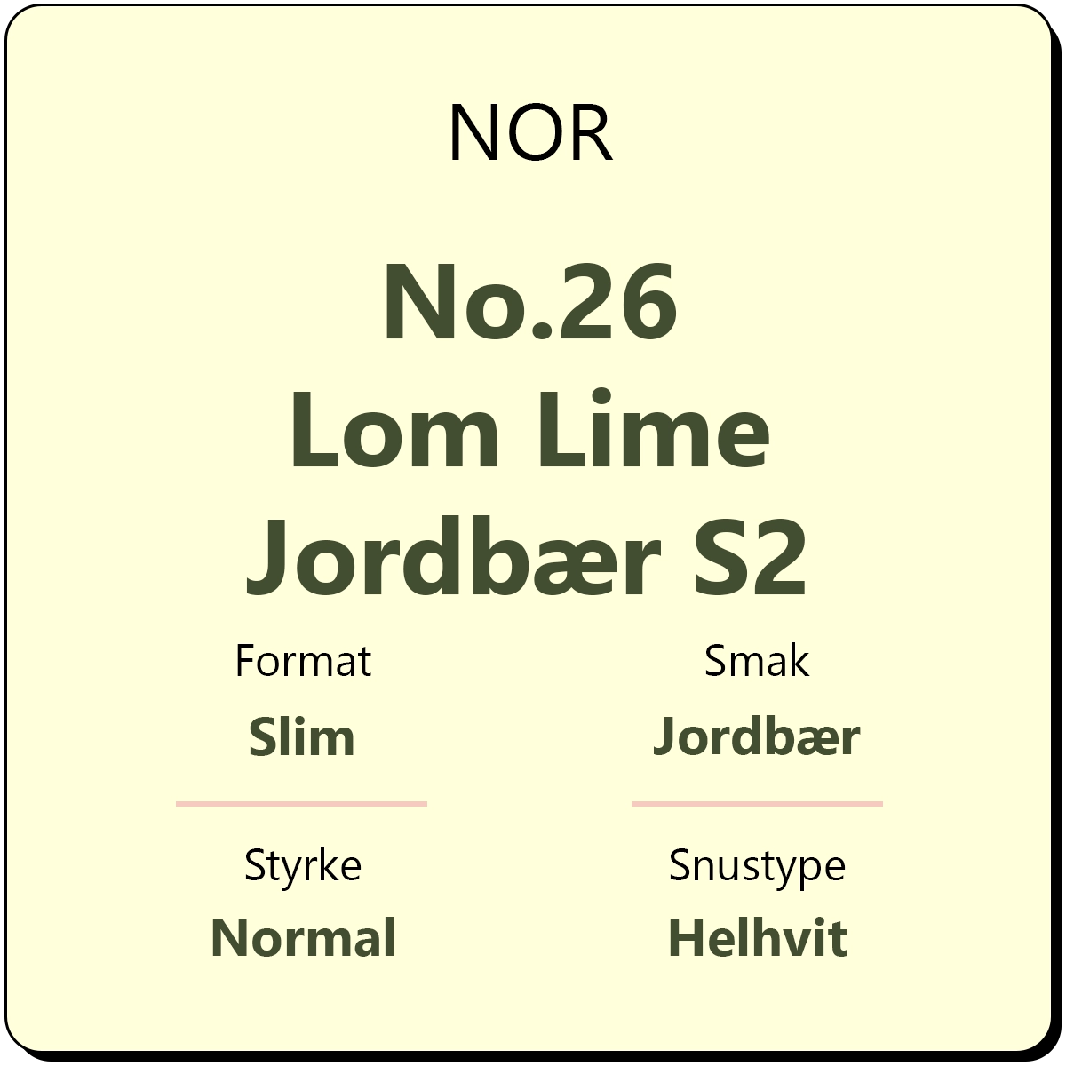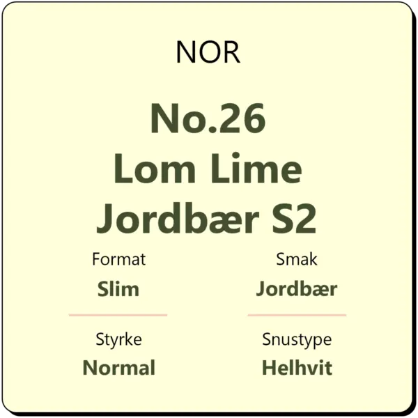 NOR No.26 Lom Lime Jordbær S2 er en normalt sterk snus fra Den Norske Snusfabrikken, en helnorsk snusprodusent. Snusen kommer i helhvite porsjonsposer i slim format med styrkegrad S2 og 8 mg/g nikotin. NOR Lom smaker av jordbær og lime, og hver boks inneholder ca. 21 porsjonsposer. Snusen produseres i Norge som den eneste som produserer helhvit snus.