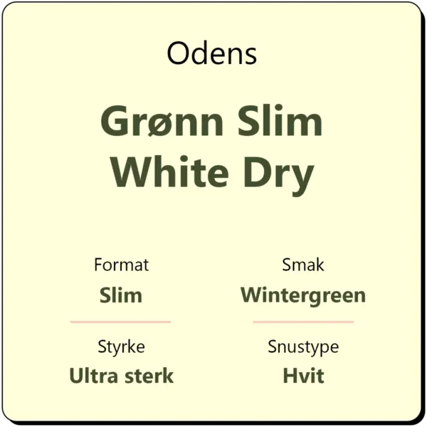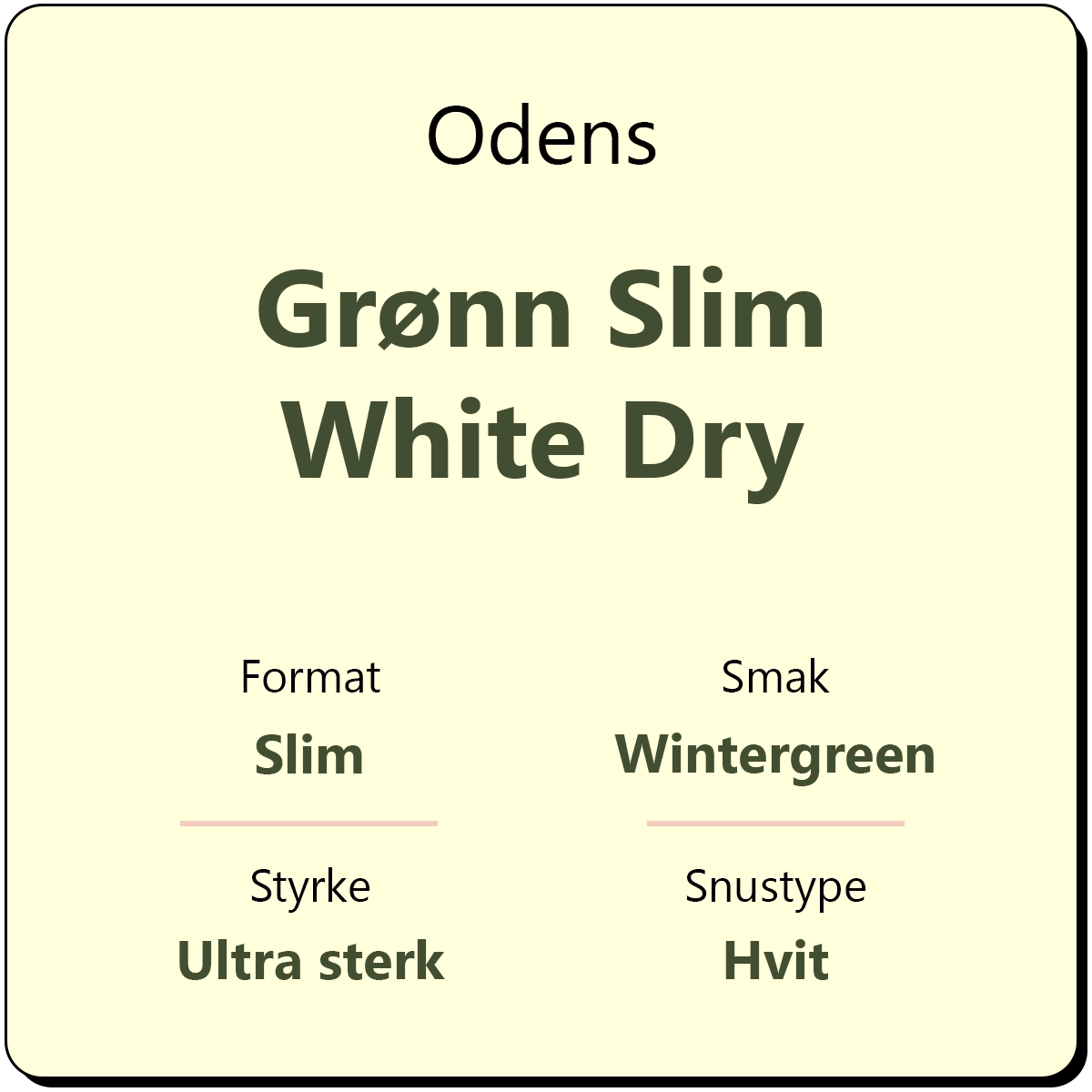 Odens Grønn Slim White Dry er en hvit snus i slim porsjon med en kraftig og klassisk smak av wintergreen. Denne varianten kjennetegnes ved sin høye styrke og er designes for erfarne snusbrukere som søker en intens opplevelse.