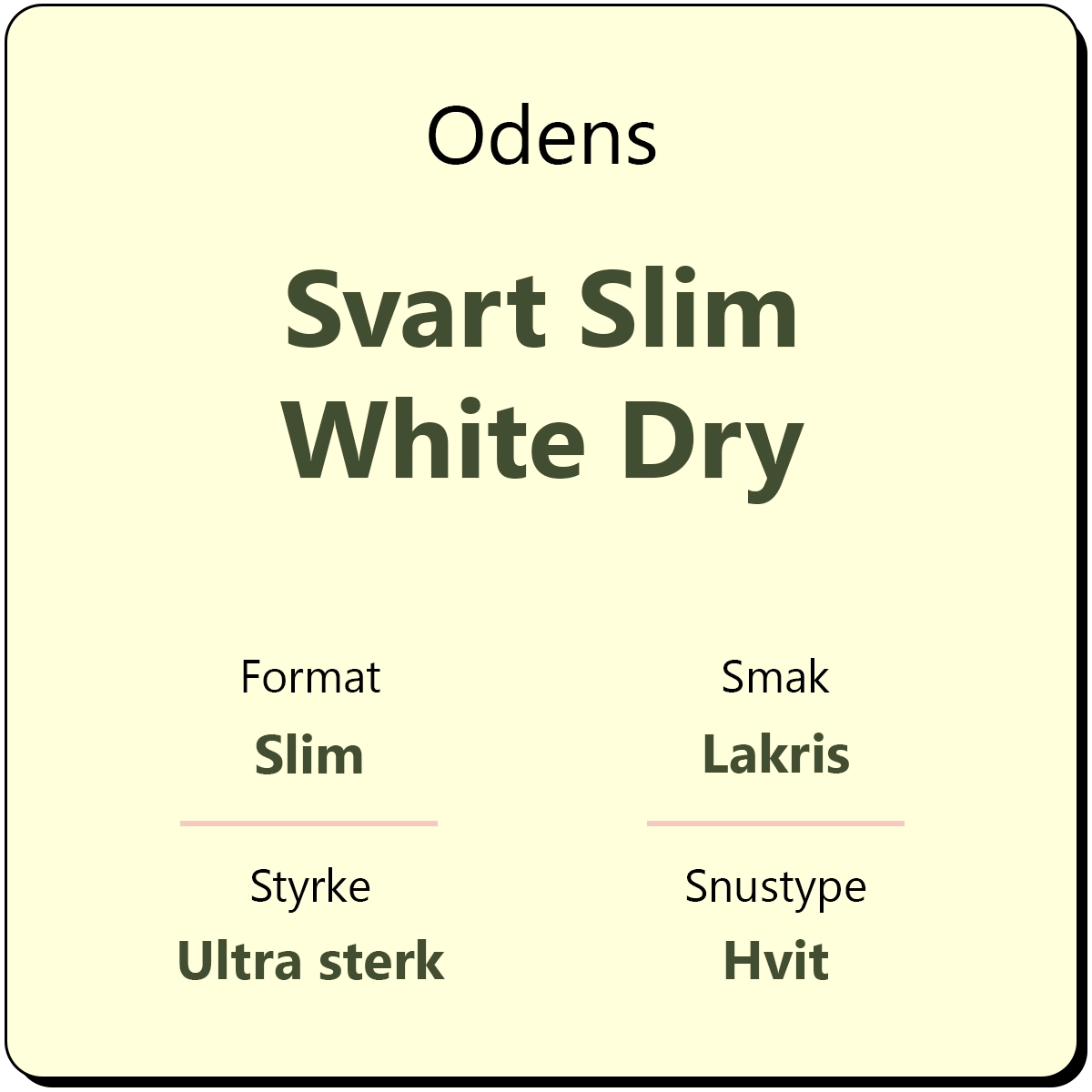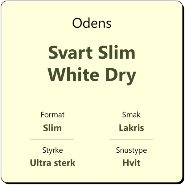 Odens Svart Slim White Dry er en hvit slim porsjonssnus med en kraftig og klassisk smak av salt lakris. Denne varianten kjennetegnes ved sin høye styrke og er designes for erfarne snusbrukere som søker en intens opplevelse.