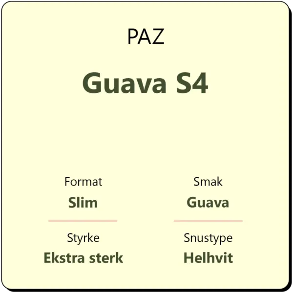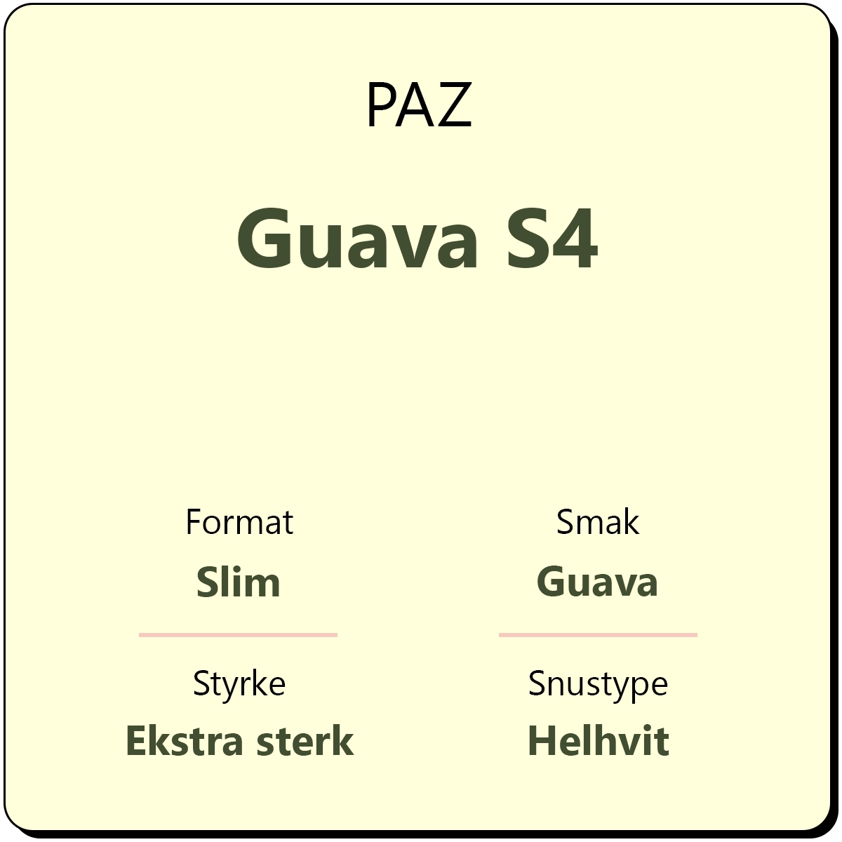 PAZ Guava S4 er en helhvit snus med et ekstra høyt nikotininnhold på 15 mg/g og en fremtredende smak av den eksotiske frukten guava.
