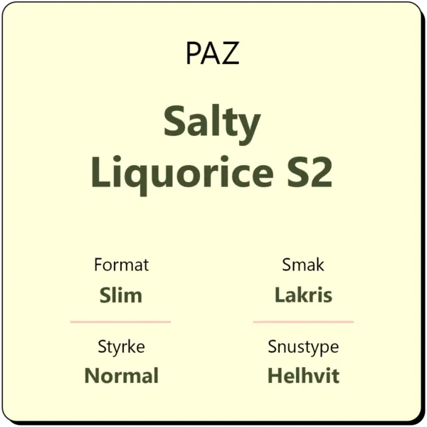PAZ Salty Liquorice S2 er en normalt sterk helhvit snus som har 10 mg/g nikotin og en tydelig smak av salt lakris.