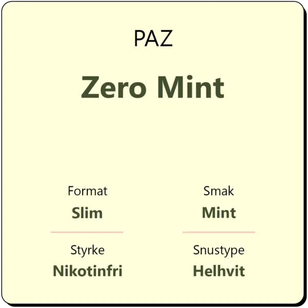 PAZ Zero Mint er en nikotin- og tobakksfri snus fra PAZ med smak av klassisk mint som gir en pirrende følelse under leppa. Denne snusen kommer i helhvite porsjonsposer i slim format. Hver boks inneholder ca. 20 porsjoner, med en totalvekt på 14 gram.