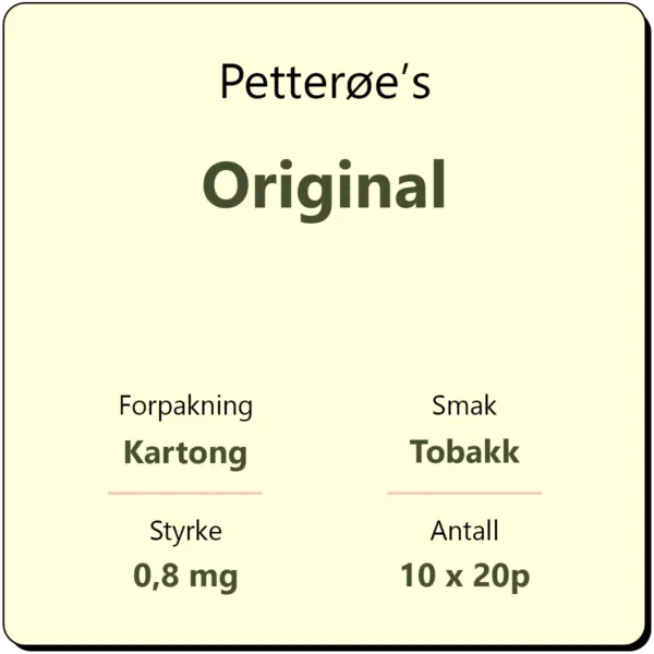 Petterøe’s Original kartong består av 10 sigarettpakker med 20 sigaretter i hver pakke. Dette er en klassisk sigarett med filter fra produsent Philip Morris International.