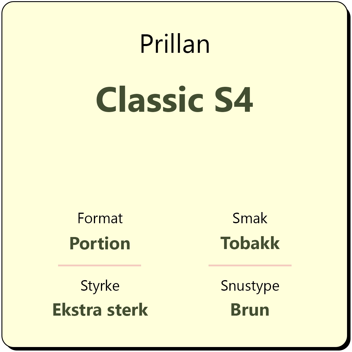 Prillan Classic S4 er en brun snus med smak av klassisk tobakk med innslag av bergamott. Hver boks inneholder ca. 20 porsjonsposer, eller 16 gram porsjonssnus. Den har en sterk nikotinstyrke på 14 mg/g, og kommer i brune originale porsjoner.