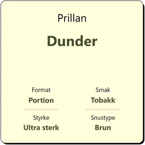 Prillan Dunder inneholder 240 gram porsjonssnus. Det tilsvarer ca. 400 porsjonsposer. Dunder er en svært sterk snus innenfor kategorien Gjør det selv. Bruk snusen som den er eller smakssett med snusaroma fra Coobra. Velg fritt mellom et stort antall forskjellige smaker og lag din helt egen smakskombinasjon. Porsjonssnusen fra Prillan er tørre, og har derfor en svært lang holdbarhetstid.