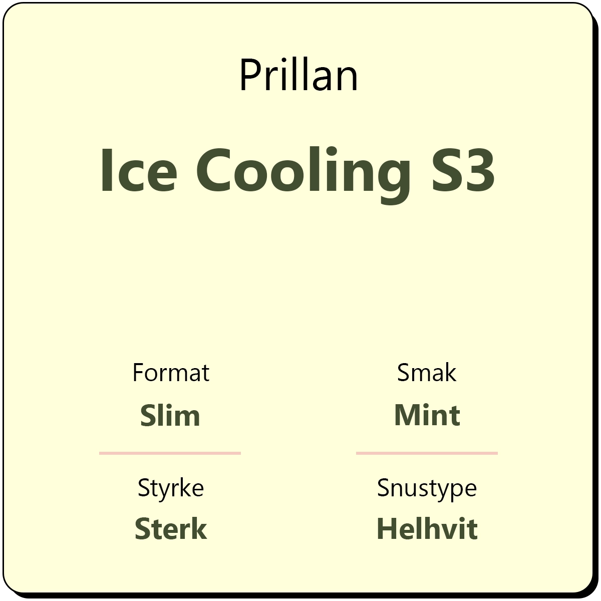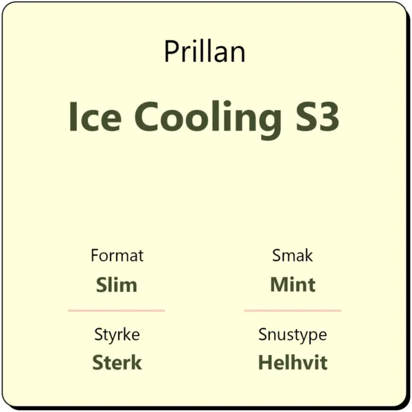 Prillan Ice Cooling S3 er en helhvit snus med smak av kjølende mint. Hver boks inneholder ca. 22 porsjonsposer, eller 15,4 gram porsjonssnus. Den har en nikotinstyrke på 12 mg/g, og kommer i helhvite slim porsjoner. Dette er en variant som tidligere kun kom i store bokser, men som nå er i vanlige snusbokser.