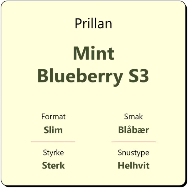 Prillan Mint Blueberry S3 er en helhvit snus med smak av blåbær og mint. Hver boks inneholder ca. 22 porsjonsposer, eller 15,4 gram porsjonssnus. Den har en nikotinstyrke på 12 mg/g, og kommer i helhvite slim porsjoner. Dette er en variant som tidligere kun kom i store bokser, men som nå er i vanlige snusbokser.