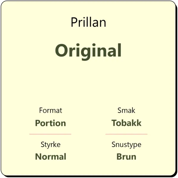 Prillan Original inneholder 165 gram porsjonssnus. Det tilsvarer ca. 500 porsjonsposer. Original er en mild snus innenfor kategorien Gjør det selv. Bruk snusen som den er eller smakssett med snusaroma. Velg fritt mellom et stort antall forskjellige smaker og lag din helt egen smakskombinasjon. Porsjonssnusen fra Prillan er tørre, og har derfor en svært lang holdbarhetstid. Snusen kan brukes som den kommer, eller fuktes før bruk.