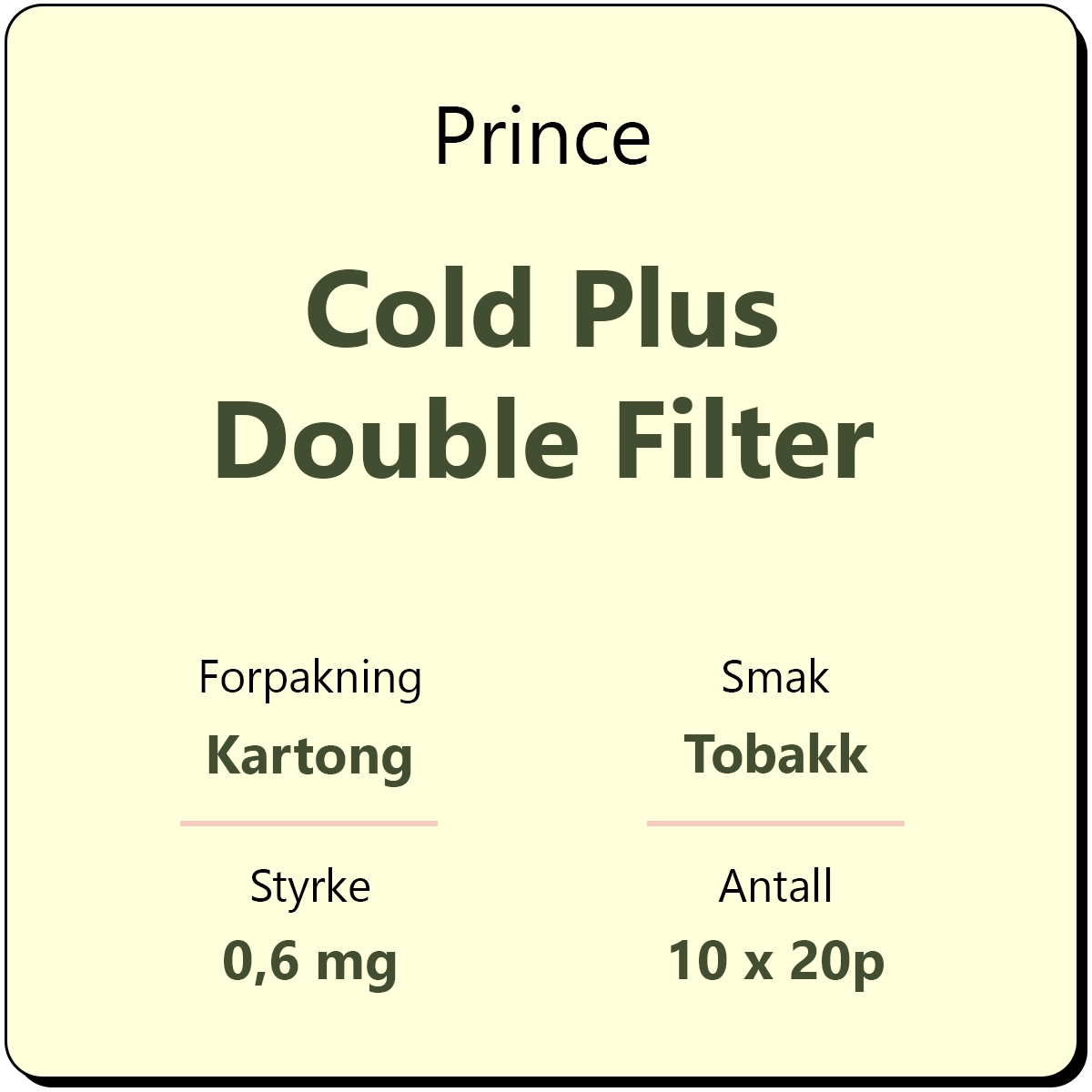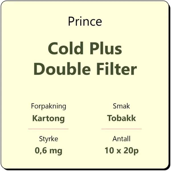 Prince Cold Plus Double Filter består av 10 sigarettpakker med 20 sigaretter i hver pakke. Dette er en klassisk sigarett med dobbel filter fra Prince.