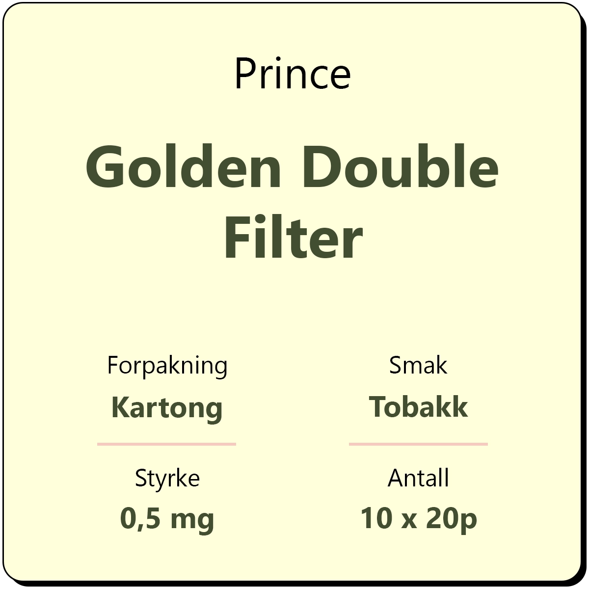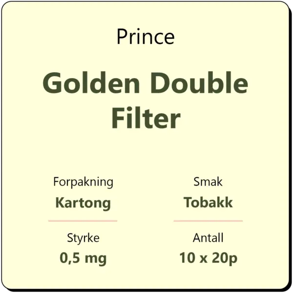 Prince Golden Double Filter består av 10 sigarettpakker med 20 sigaretter i hver pakke. Dette er en klassisk sigarett med dobbel filter fra Prince.