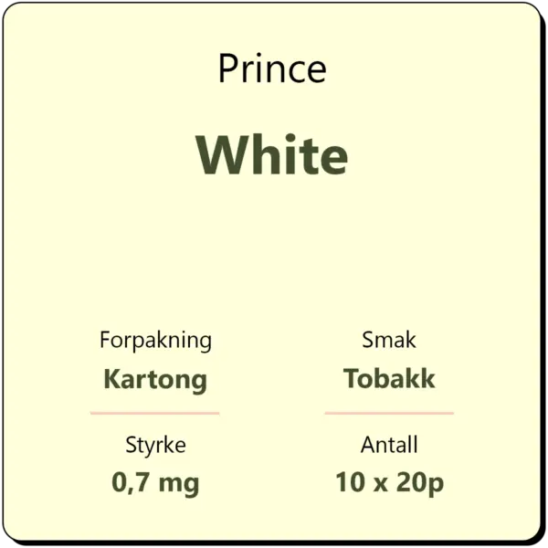 Prince White består av 10 sigarettpakker med 20 sigaretter i hver pakke. Dette er en klassisk sigarett med filter fra Prince.