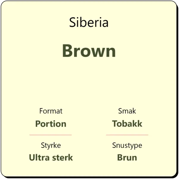 Siberia Brown er en ultra sterk snus med et nikotininnhold på hele 43 mg/g. Snusen fra Siberia byr på en smakskombinasjon av tradisjonell tobakk og mint. Varianten Brown kommer i klassisk brune poser i et originalt porsjonsformat. Hver boks inneholder ca. 20 porsjoner med snus.