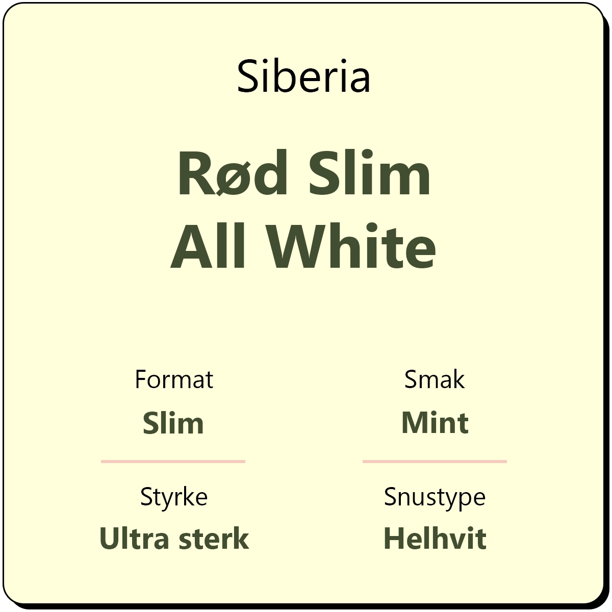 Siberia Rød Slim All White er en helhvit snus med en intens smak av kjølig mint og en ekstremt sterk nikotinopplevelse. Siberia er kjent for sine kraftige snusprodukter som leverer en uvanlig høy nikotinstyrke kombinert med en iskald, oppkvikkende smak. Denne varianten har hvite poser, noe som ikke misfarger tennene.