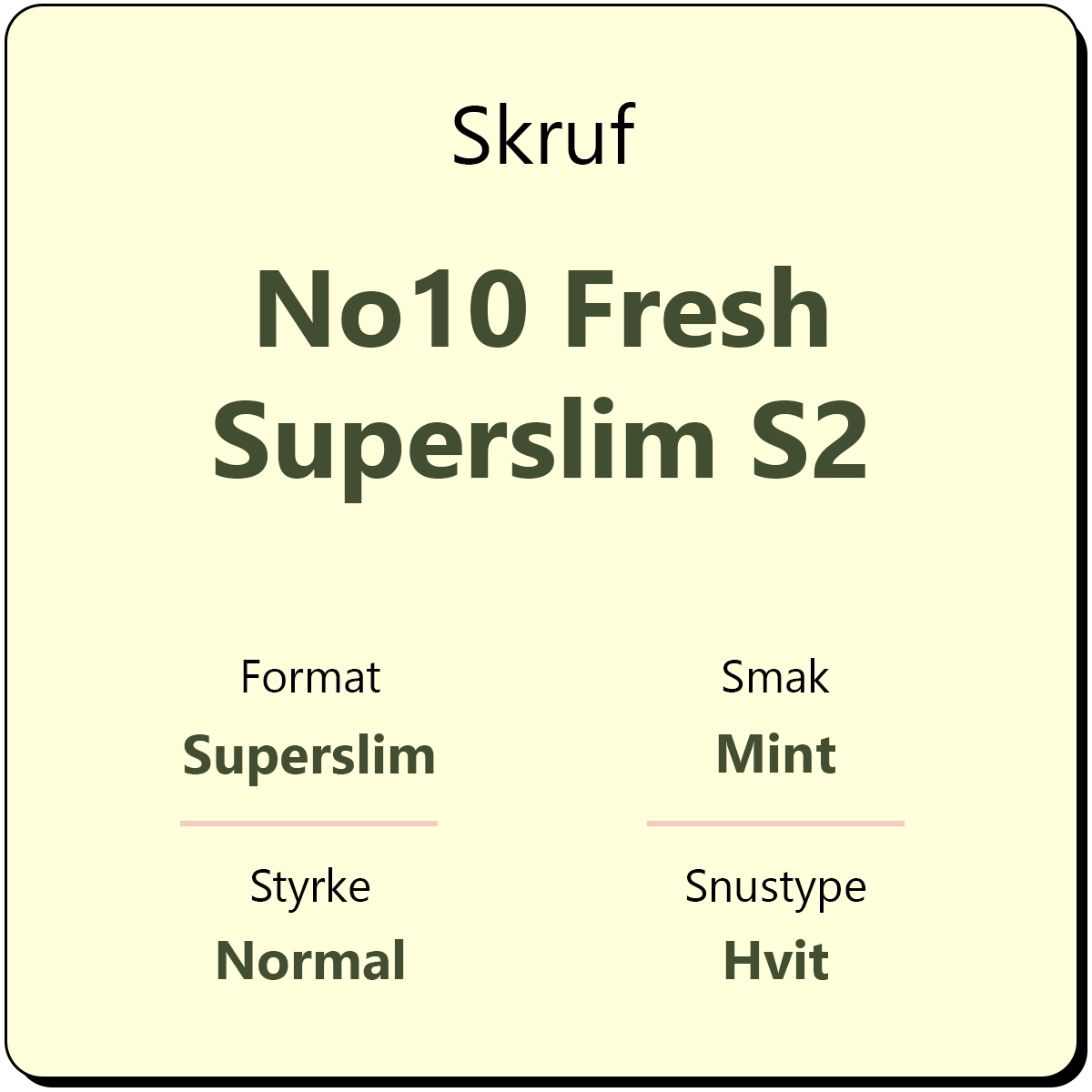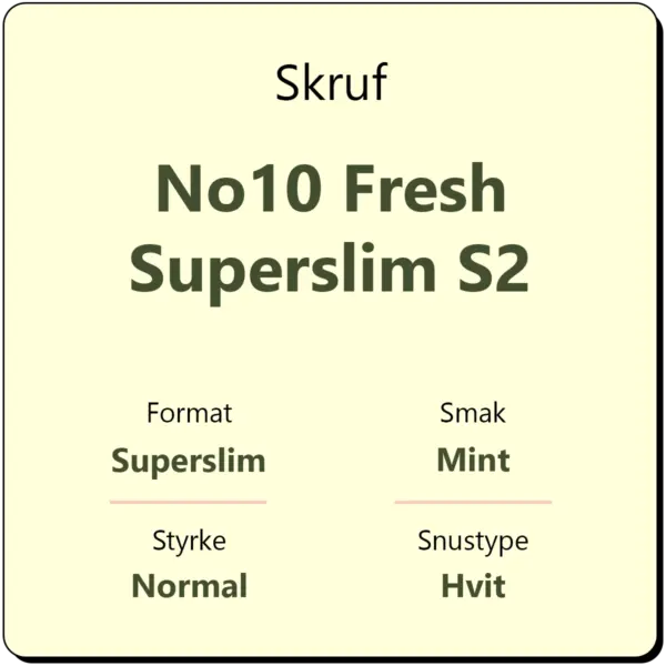 Skruf No10 Fresh Superslim S2 er en snus fra Skruf med smak av mint i en hvit superslim porsjonspose. Skruf Superslim inneholder 11 mg/g nikotin, og er definert som en mildere snus. Hver boks inneholder ca. 30 porsjonsposer.