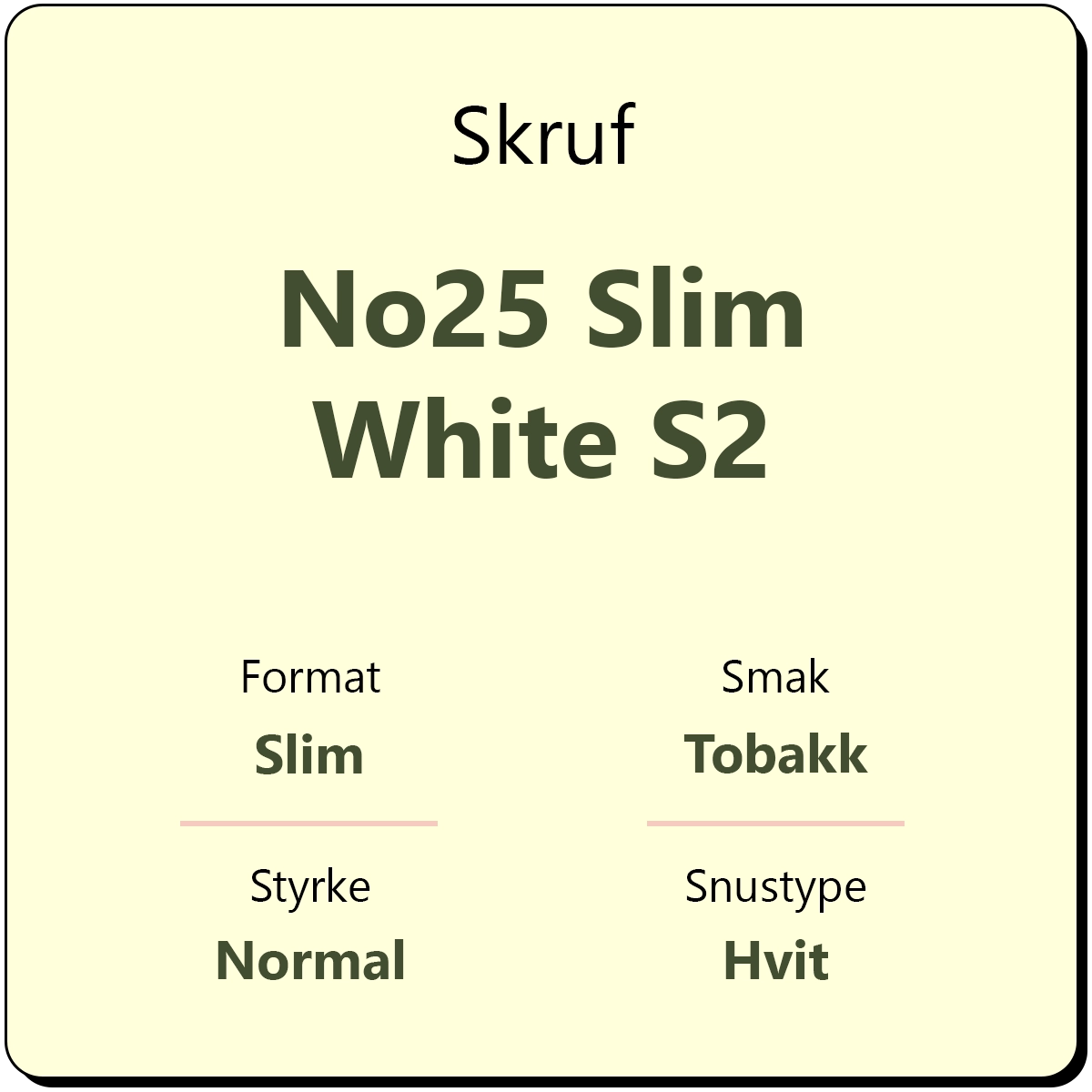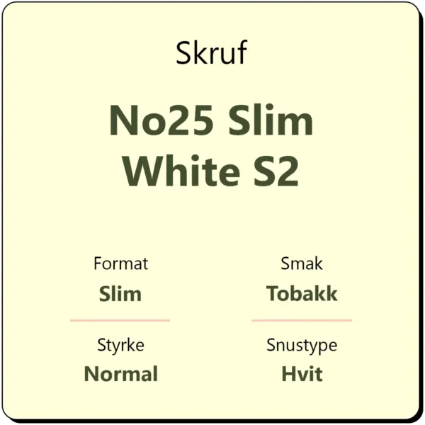 Skruf No25 Slim White S2 er en hvit snus i slim porsjon med smak av mild tobakk og et hint av bergamott. Skruf No25 inneholder 11 mg/g nikotin som gjør det til en snus med normal styrke. Det er ca. 24 porsjonsposer i hver boks med Slim White S2.
