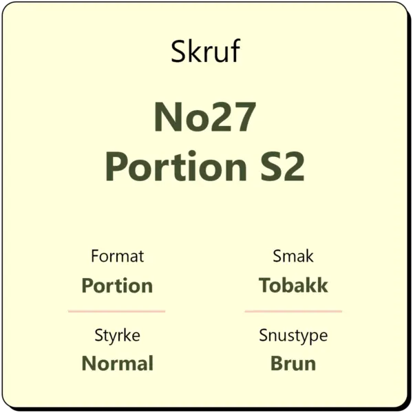 Skruf No27 Portion S2 er en original porsjonssnus med 11 mg/g nikotin. Portion S2 har en mild smak av klassisk tobakk og bergamott. Skruf No27 har et høyt fuktighetsinnhold og kommer i originale brune porsjonsposer.