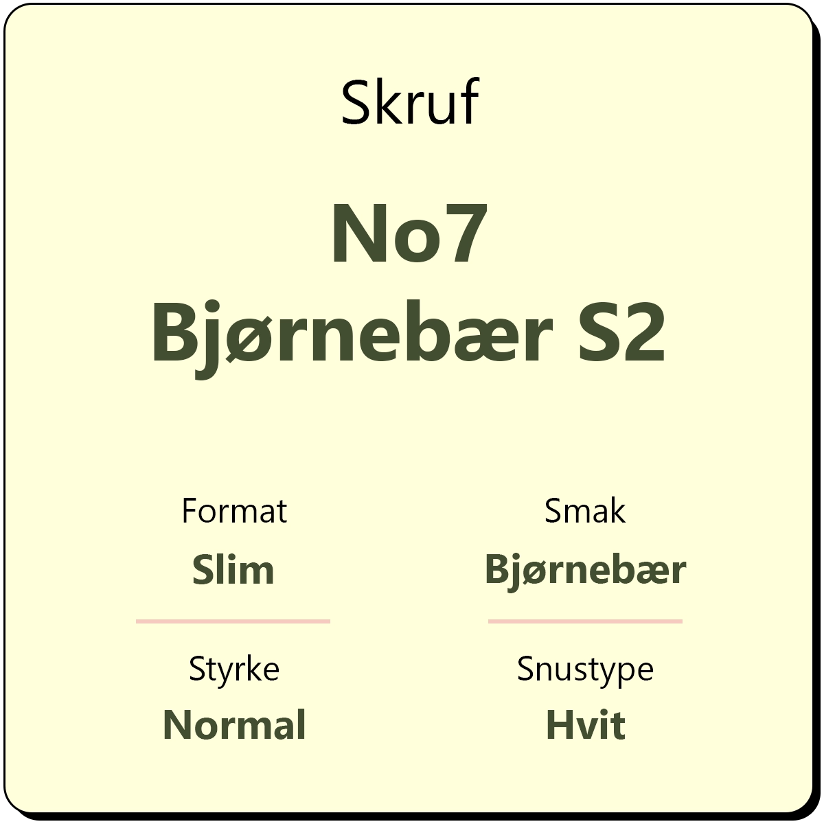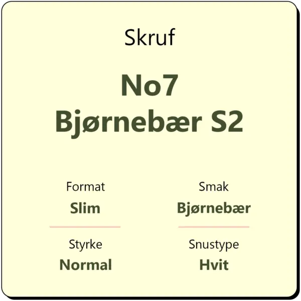 Skruf No7 Bjørnebær S2 er en original snus med smak av bjørnebær. Skruf No7 er en mild snus med et nikotininnhold på 11 mg/g. Hver boks inneholder ca. 24 snus som kommer i hvite slim porsjonsposer.