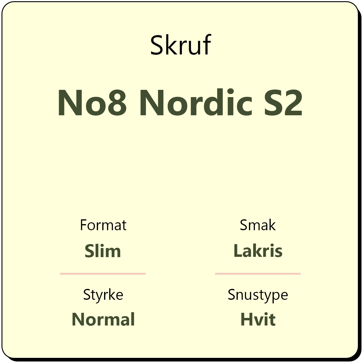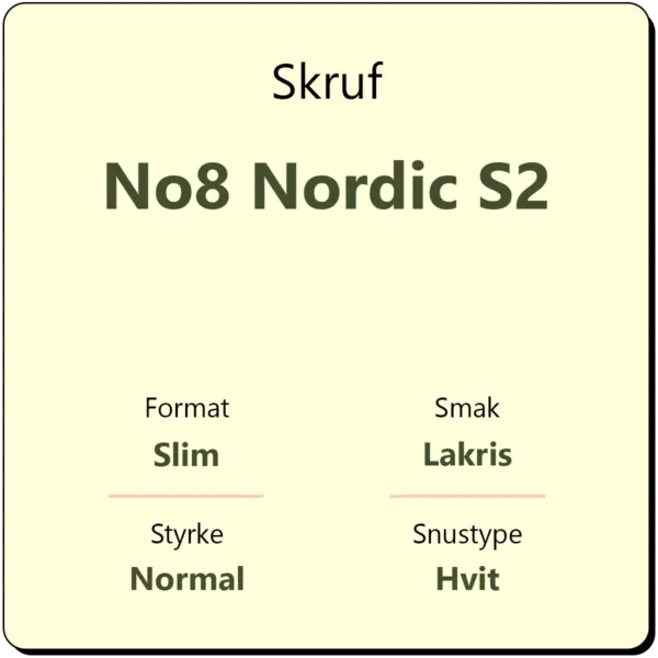 Skruf No8 Nordic S2 har en smak av søt lakris i slim porsjon. Snusen har et nikotininnhold på 11 mg/g nikotin og et lavere fuktighetsinnhold enn annen original snus. Skruf No8 kommer i hvite porsjoner i slim format. Snusen inneholder både nikotin og tobakk. Posen er hvitfarget, men innholdet i porsjonsposene er ikke bleket.