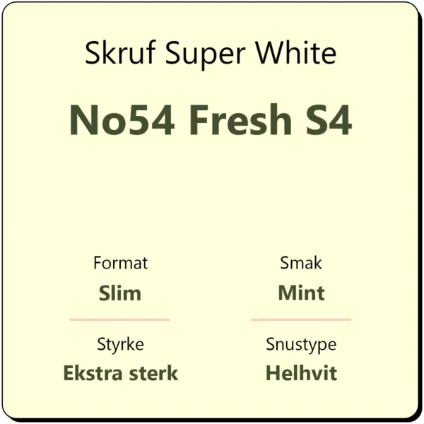 Skruf Super White No54 Fresh S4 er en sterkere variant av Skruf sin No52 Fresh S2, med den samme smaken av sødmefull mint. No54 Fresh S4 er med 17 mg/g nikotin og helhvite porsjonsposer i slim format.