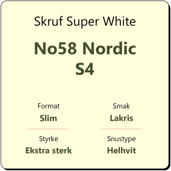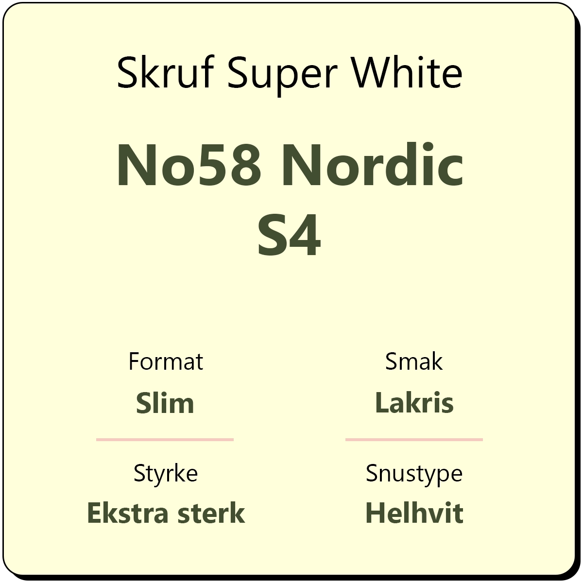 Skruf Super White No58 Nordic S4 er en ekstra sterk snus med 17 mg/g nikotin og en smak av sødmefull lakris. No58 Nordic S4 kommer i helhvite porsjonsposer i slim format. Hver boks inneholder ca. 24 porsjonsposer.