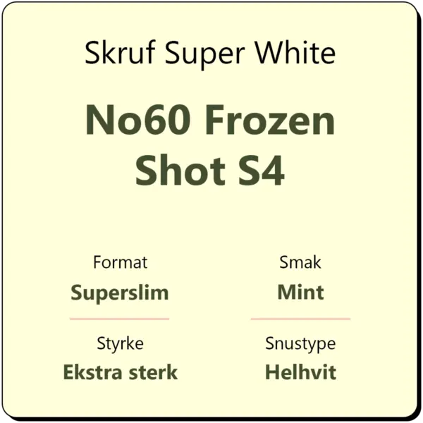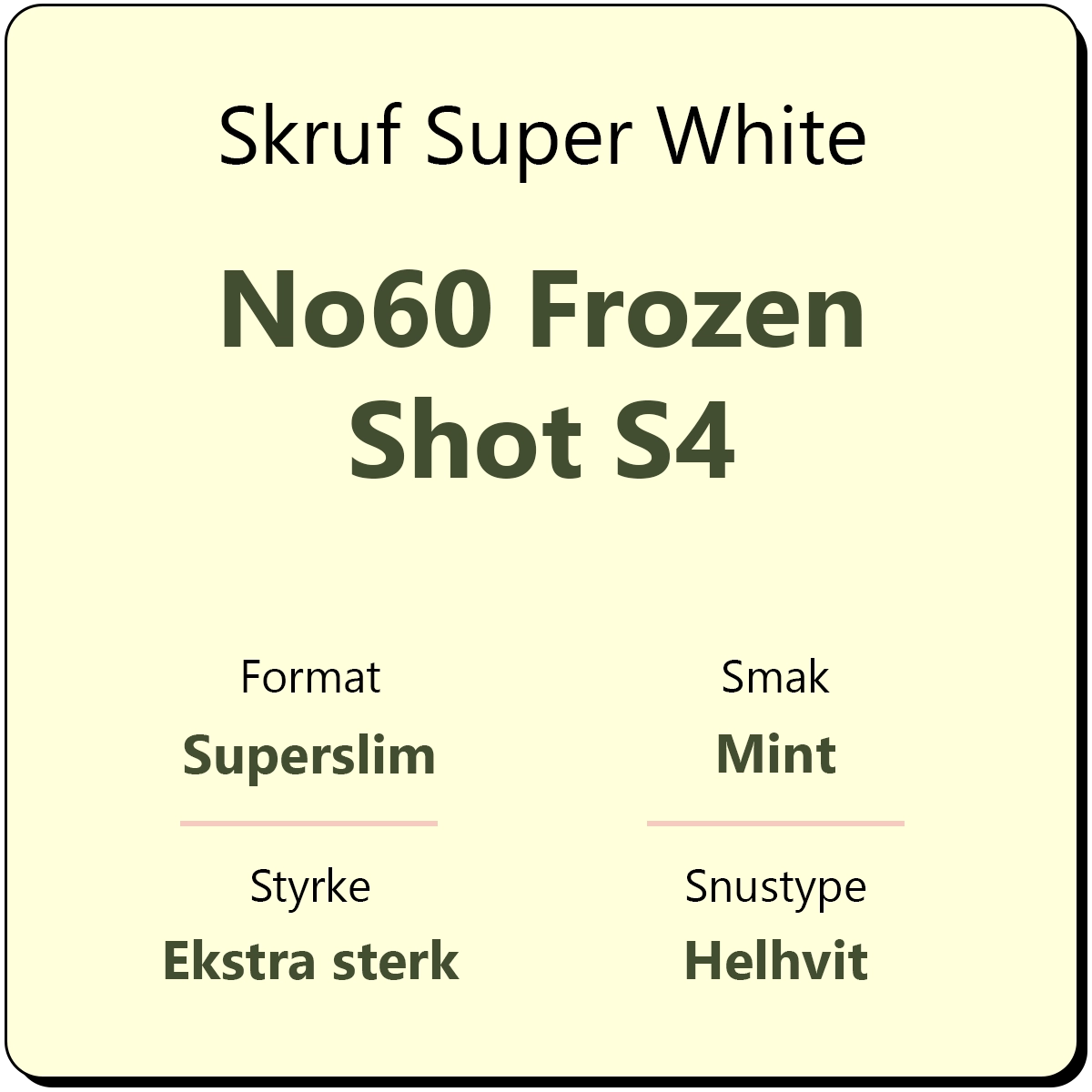 Skruf Super White No60 Frozen Shot S4 er en helhvit snus i superslim porsjon med en smak av intens mint. Med 17 mg/g nikotin er dette en ekstra sterk snus, tilsvarende styrkegrad S4.