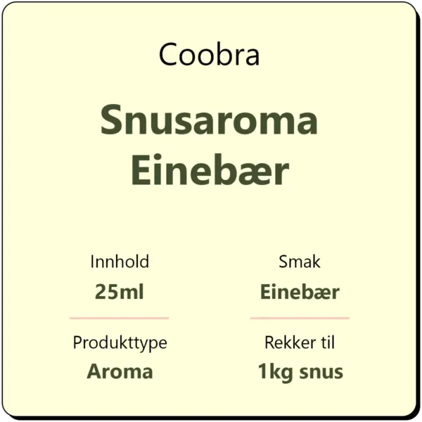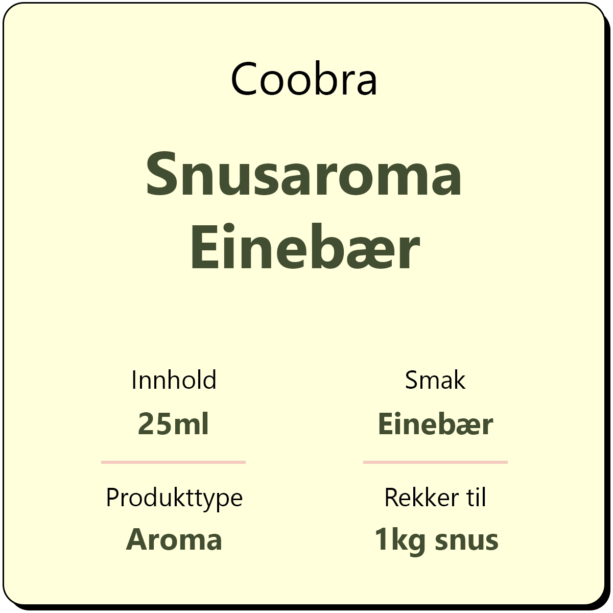 Snusaroma Coobra Einebær gir din snus en aroma av einebær. Flasken inneholder 25 ml. væske. En flaske holder til ca. 1 kg snus. Tilsett ønsket mengde vann, salt og aroma. 2-3 døgn i kjøleskapet gir beste resultat mht. smak.