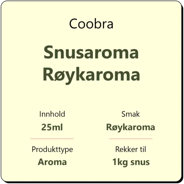 Snusaroma Coobra Røykaroma gir din snus en aroma av røyksmak. Flasken inneholder 25 ml. væske. En flaske holder til ca. 1 kg snus. Tilsett ønsket mengde vann, salt og aroma. 2-3 døgn i kjøleskapet gir beste resultat mht. smak.