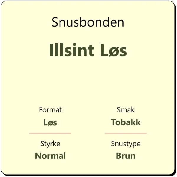Snusbonden Illsint Løs er en ny versjon av en tidligere snus fra Snusbonden, også kalt Illsint. Illsint Løs smaker av en norskprodusert tradisjonell tobakk og Bareksten Illsint Absint, som minner om smaken av anis. I tillegg er det tilsatt smak fra anis, svart pepper og bergamott.
