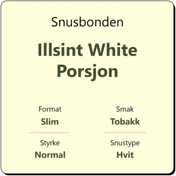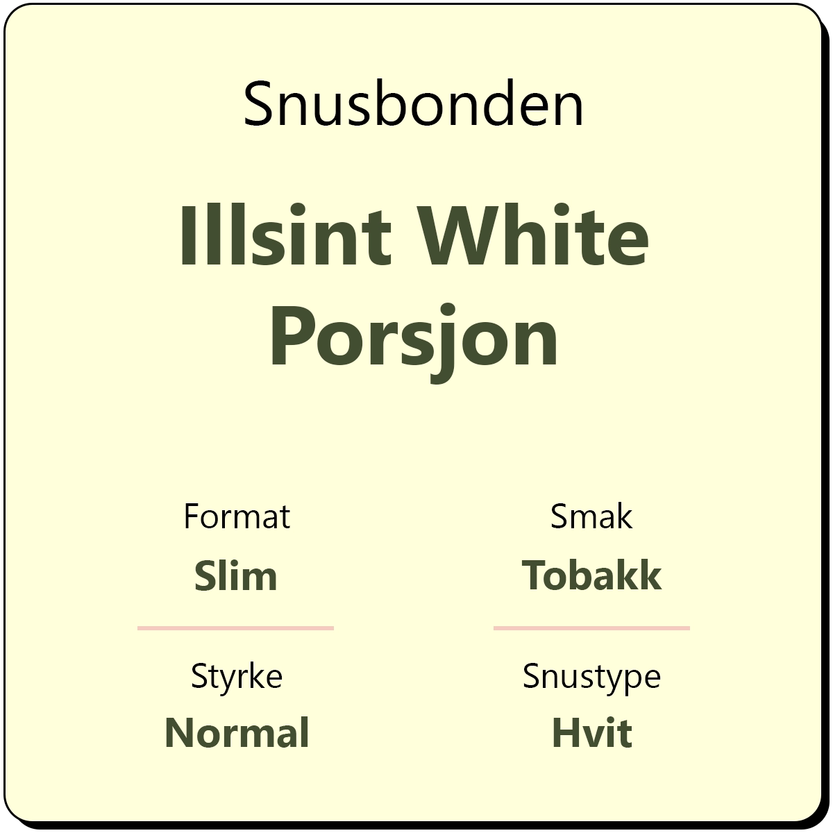 Snusbonden Illsint White Porsjon er den eneste varianten fra Snusbonden som er tørr hvit snus i slim porsjon. Snusbonden Illsint er basert på en tidligere snus fra Snusbonden, også denne med navnet Illsint.