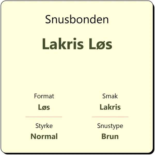 Snusbonden Lakris Løs er en håndlaget snus som representerer det ypperste innen Snusbondens tradisjonelle håndverk. Denne varianten produseres og dyrkes i Norge med førsteklasses tobakk fra åkeren på Byneset. Med en vekt på 40 gram per boks og en nikotinstyrke på 10 mg/g, tilbyr Lakris Løs en autentisk snusopplevelse for de som foretrekker en klassisk lakrissmak.