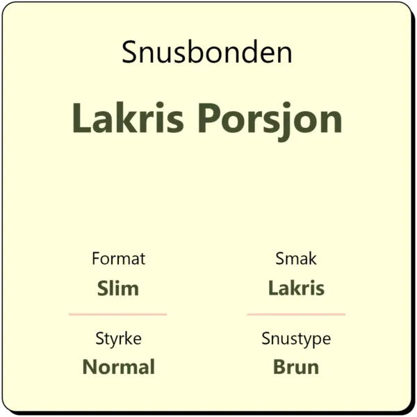 Snusbonden Lakris Porsjon er en håndlaget porsjonssnus som representerer det beste innen tradisjonelt norsk snushåndverk. Denne varianten produseres og dyrkes i Norge med førsteklasses tobakk fra åkeren på Byneset. Med en vekt på 20 gram per boks og en nikotinstyrke på 10 mg/g, gir Lakris porsjon en klassisk snusopplevelse med en fyldig og autentisk lakrissmak.