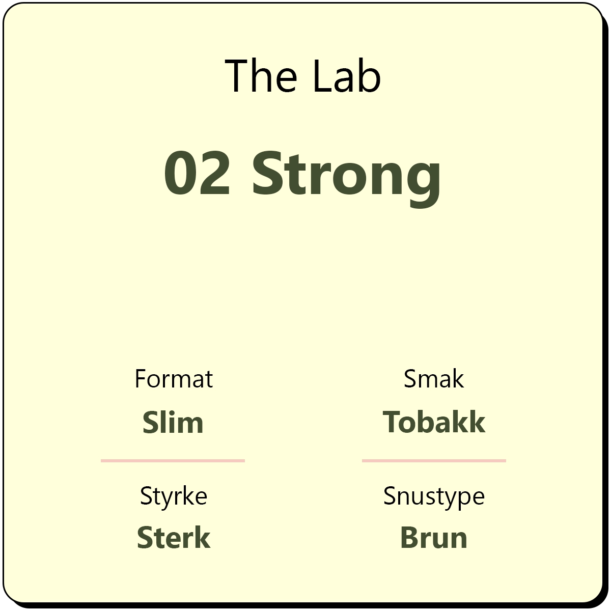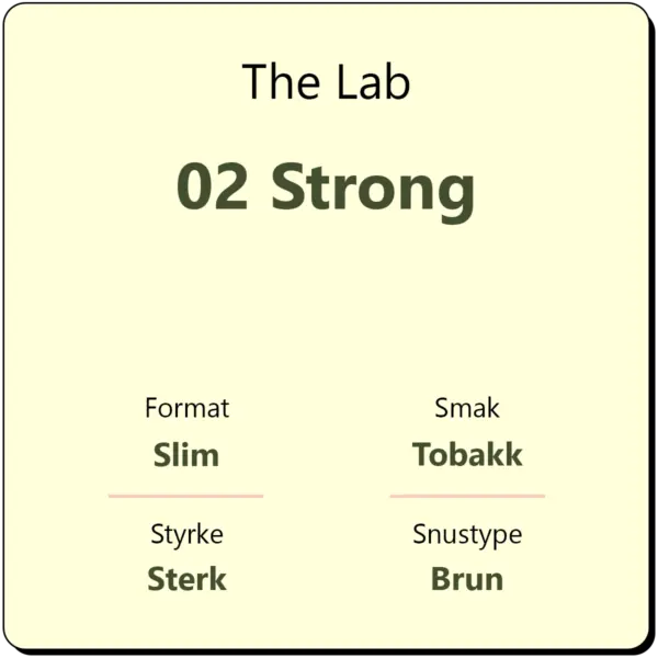 The Lab 02 Strong er en original brun snus i et slim porsjonsformat med smak av tradisjonell tobakk med hint av eik, sedertre og urter. The Lab 02 er en sterk snus med et nikotininnhold på 15 mg/g. The Lab var det første produktet som ble lansert i Norge med slim porsjon for en mer komfortabel snusopplevelse.