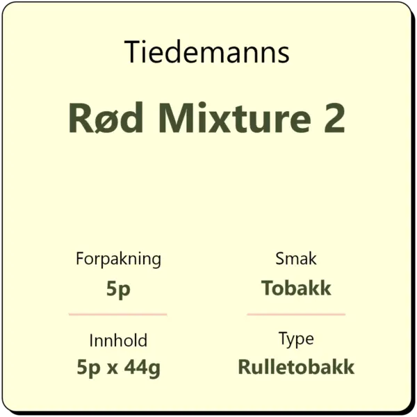 Tiedemanns Rød Mixture 2 5p inneholder 5 pakker med ekte norsk rulletobakk fra produsent Scandinavian Tobacco Group. Dette er en grovsnittet rulletobakk som inneholder både Virginia og Dark Fired Tobacco.