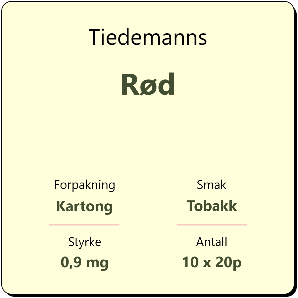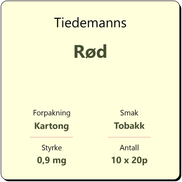 Tiedemanns Rød består av 10 sigarettpakker med 20 sigaretter i hver pakke. Dette er en klassisk sigarett med filter fra produsent Scandinavian Tobacco Group. Alle sigaretter som selges hos Snusbutikk oppbevares i en spesialbygd humidor som holder fuktigheten på sigarettene over 60 %, slik at du alltid skal få fersk tobakk når du handler hos oss.