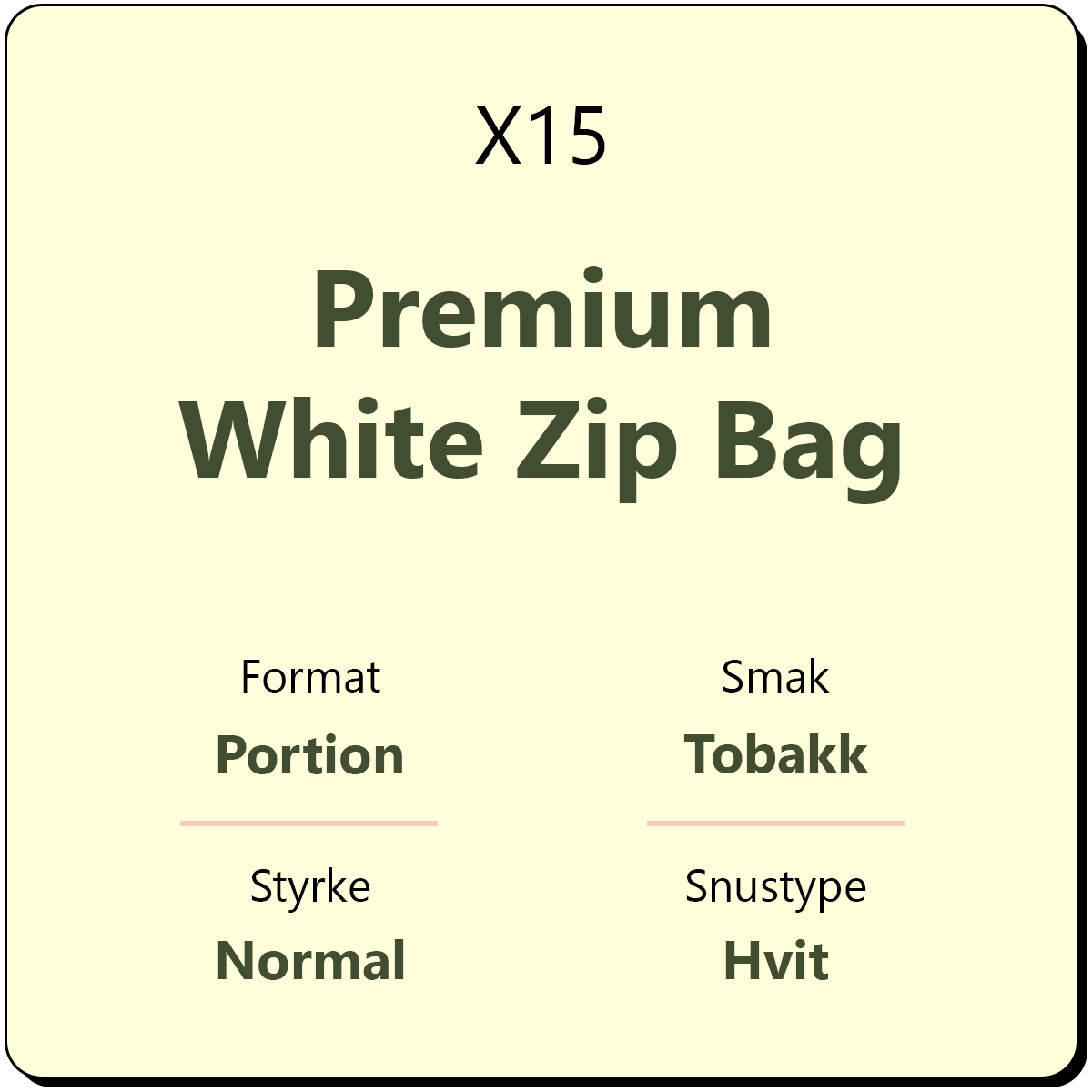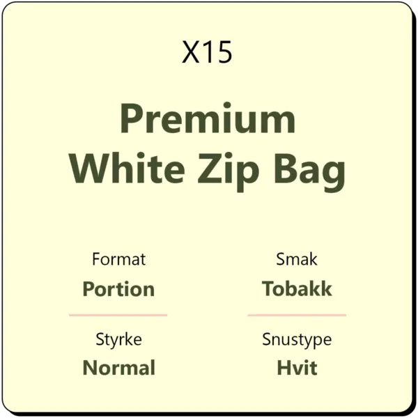 X15 Premium White Zip Bag inneholder 150 gram porsjonssnus. Det tilsvarer ca. 500 porsjonsposer. X15 Premium White er en normal snus innenfor kategorien Gjør det selv. Bruk snusen som den er eller smakssett med snusaroma.