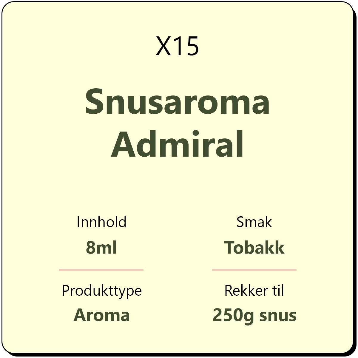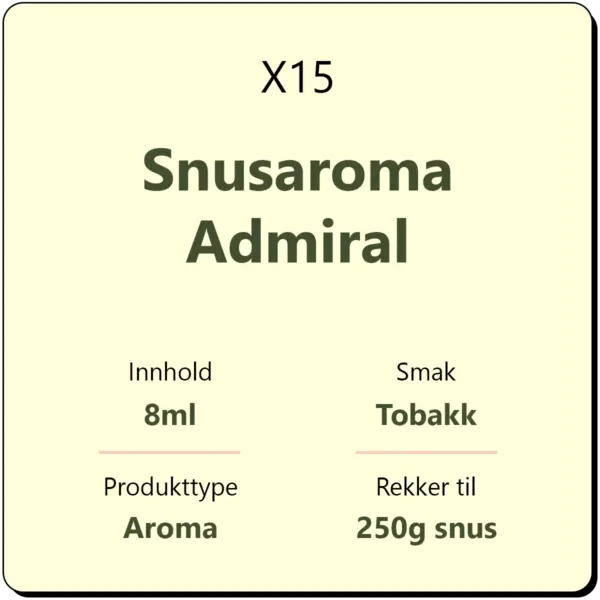 X15 Snusaroma Admiral gir din Gjør det selv-snus en klassisk smak av tobakk. Flasken inneholder 8 ml. snusaroma som gjør at en flaske holder til ca. 250 gram snus. Tilsett ønsket mengde vann, salt (kun enkelte varianter) og aroma. La snusen ligge i ca. 2-3 døgn i kjøleskapet for et optimalt resultat med henhold til smak.