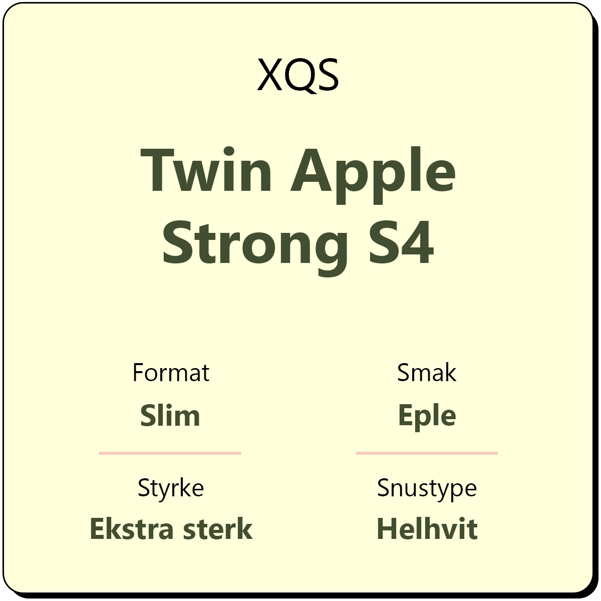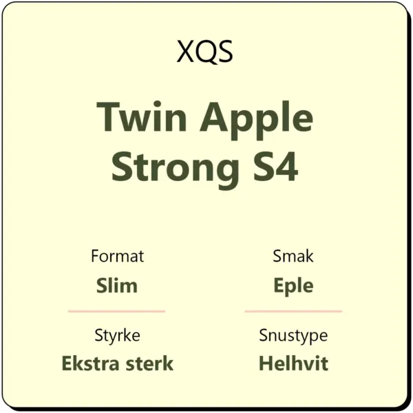 XQS Twin Apple Strong S4 er en snus med smak av to forskjellige typer eple. Med et nikotininnhold på 20 mg/g karakteriseres denne som en ekstra sterk snus med styrkegrad S4. XQS Twin Apple kommer i helhvite porsjonsposer i porsjonsformatet slim for en diskré snusopplevelse.