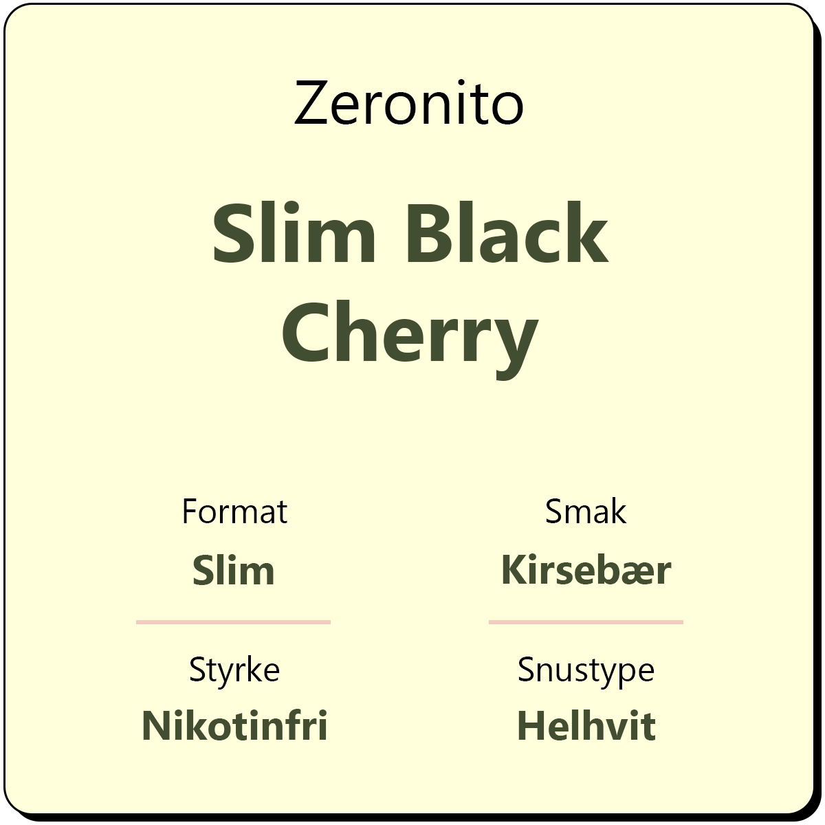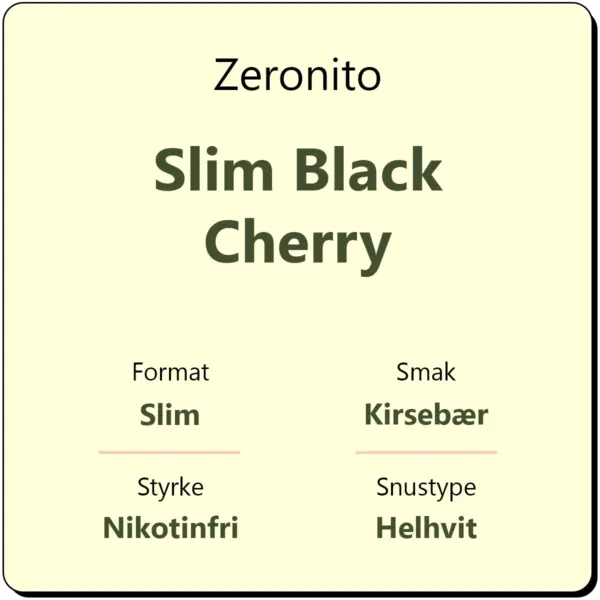 Zeronito Slim Black Cherry er en helhvit snus som er helt fri for både tobakk og nikotin. Den smaker kirsebær, og en boks gir deg omtrent 20 porsjonsposer.