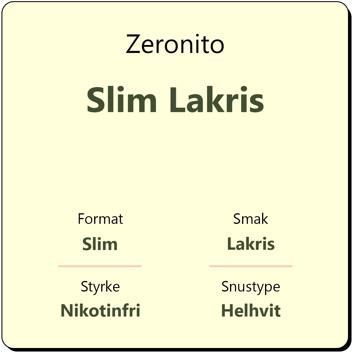 Zeronito Slim Lakris er en helhvit snus som er helt fri for både tobakk og nikotin. Den smaker lakris, og en boks gir deg omtrent 20 porsjonsposer.