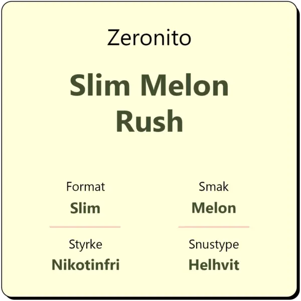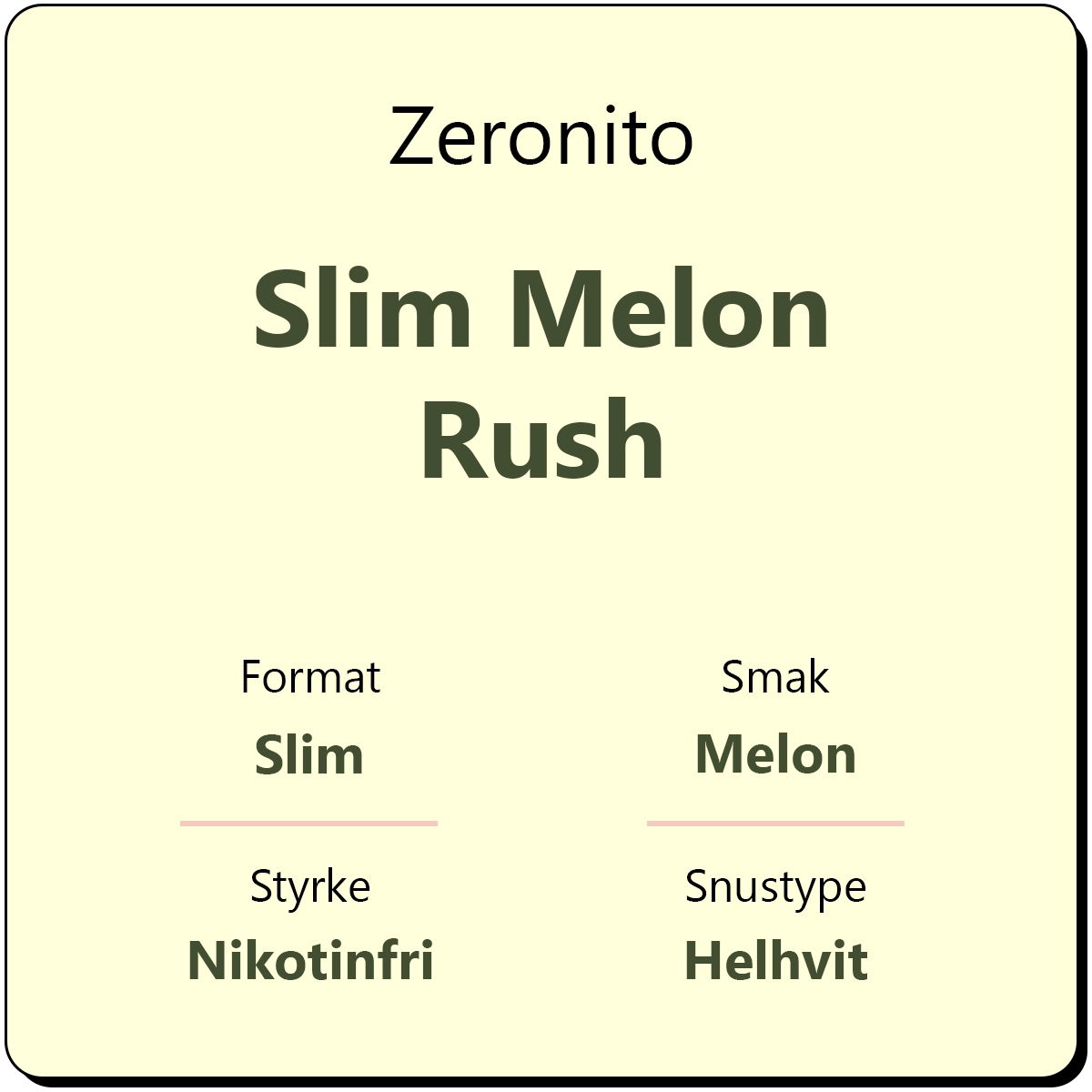 Zeronito Slim Melon Rush er en helhvit snus som er helt fri for både tobakk og nikotin. Den smaker av melon, og en boks gir deg omtrent 20 porsjonsposer.