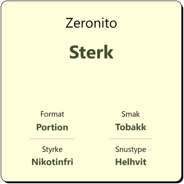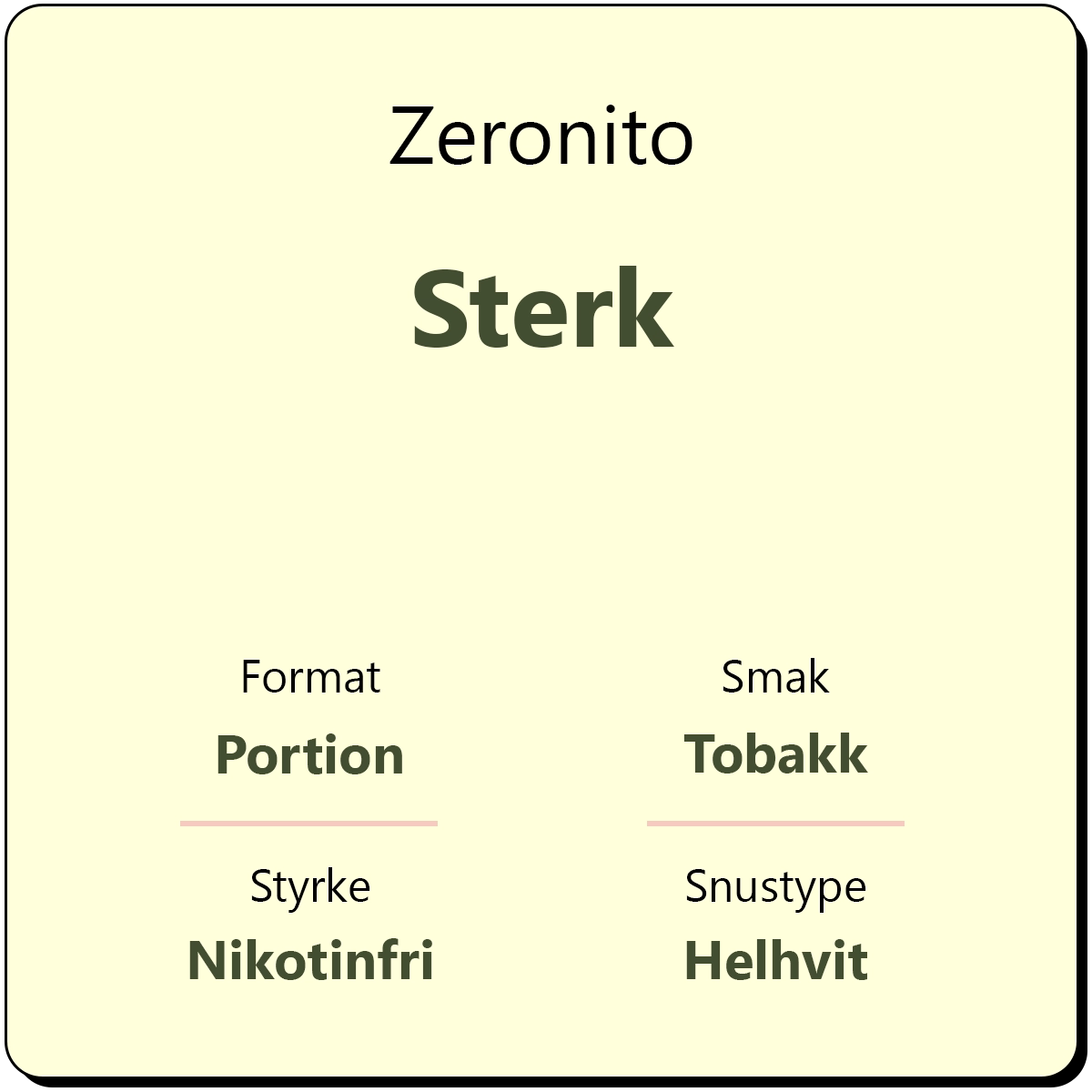 Zeronito Sterk er en helhvit snus som er helt fri for både tobakk og nikotin. Den har en tydelig smak av tradisjonell tobakk, men helt fri for avhengighetsskapende eller skadelige stoffer. En boks inneholder omtrent 20 porsjonsposer.