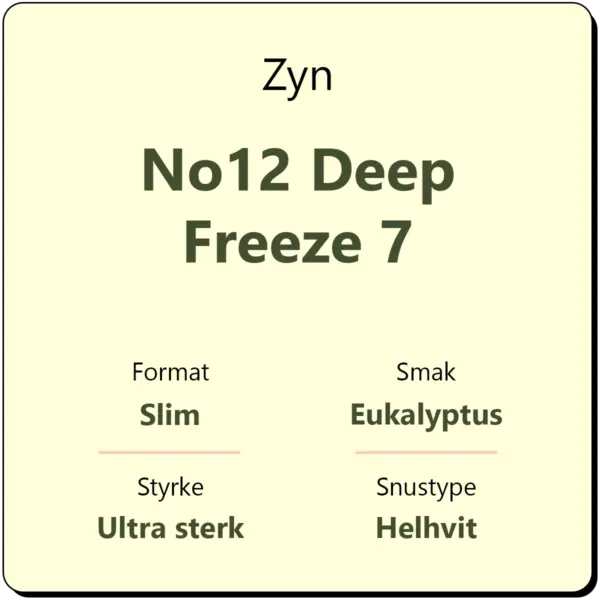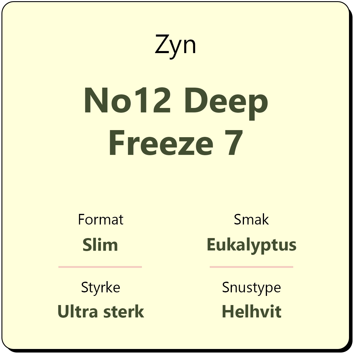 Zyn No12 Deep Freeze 7 er en hvit snus i hvite slim porsjonsposer, med en blandet smak av både eukalyptus og mentol. Med et nikotininnhold på 23,7 mg/g er dette klassifisert som en ultra sterk snus, tilsvarende styrkegrad 7 ifølge Zyn. Boksen inneholder ca. 22 helhvite porsjoner.