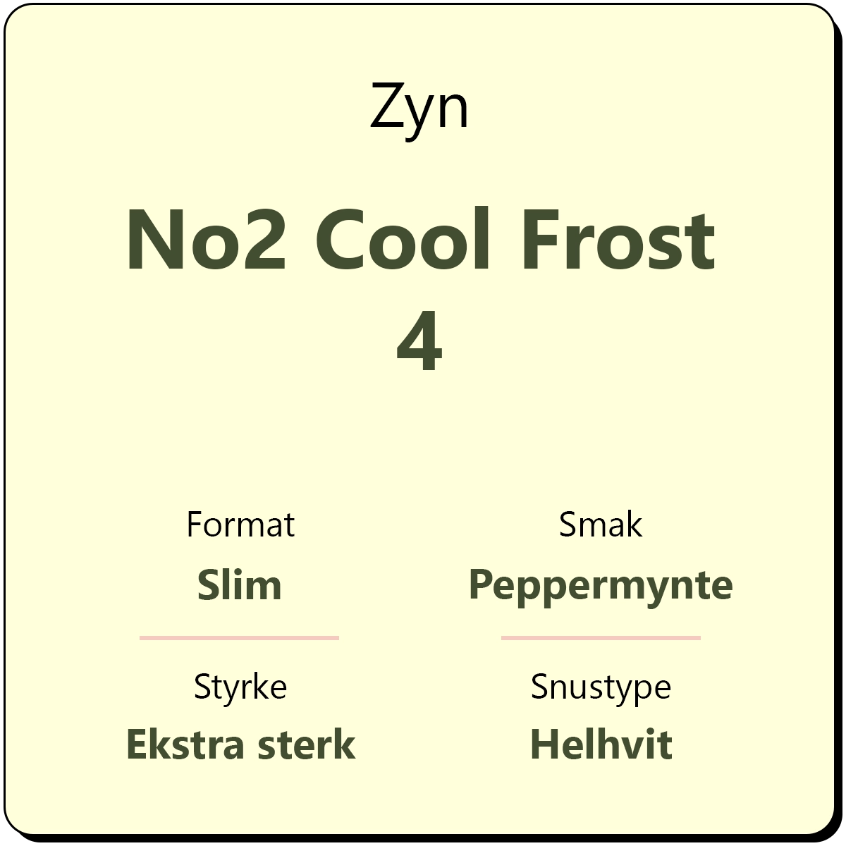 Zyn No2 Cool Frost 4 er en hvit snus i hvite slim porsjonsposer, med smak av peppermynte, mint og mentol. Med et nikotininnhold på 15,7 mg/g er dette klassifisert som en ekstra sterk snus, tilsvarende styrkegrad 4 eller S4, ifølge Zyn. Bokser inneholder ca. 22 helhvite porsjoner.