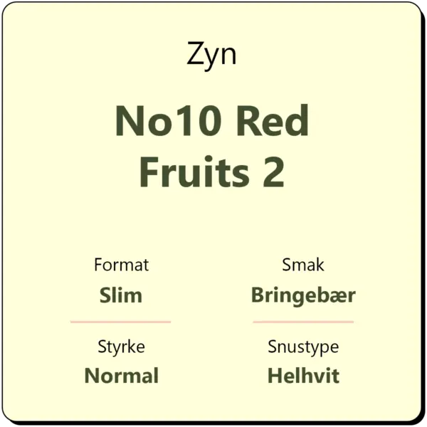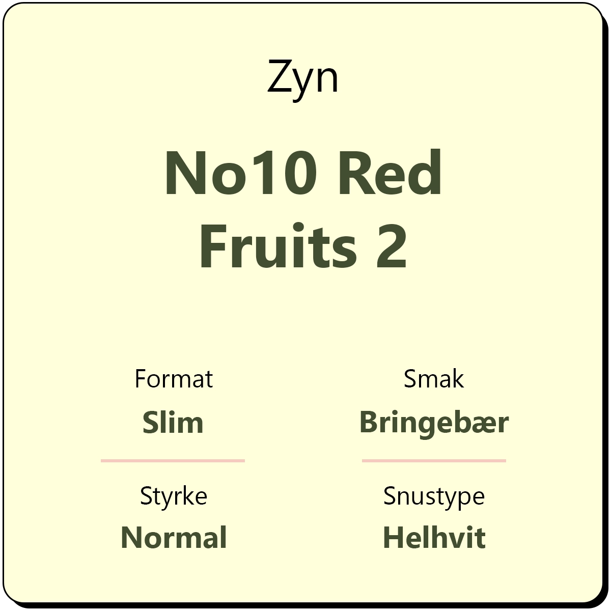 Zyn No10 Red Fruits 2 er en helhvit slim porsjonssnus med en blandet smak av jordbær, bringebær, rabarbra og mentol. Med et nikotininnhold på 9,3 mg/g er dette klassifisert som en normalt sterk snus, tilsvarende styrkegrad 2 ifølge Zyn. Boksen inneholder ca. 22 porsjoner.